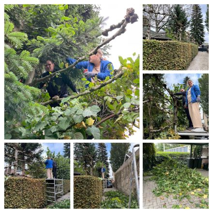 Daarna naar de Wilhelminastraat gereden en gegeten en toen is Desiree begonnen met snoeien van de leilindes. Ruud was er ook wat vroeger en die is mee gaan knippen. Danielle verrichtte overal hand en spandiensten en aan het einde van de middag waren alle bomen gesnoeid. Alles op een hoop achter gegooid en later de aanhangwagen gehaald dus morgen nog even opruimen. Danielle en Rob bleven hier eten en later op de avond gingen die naar een feest en bleef Senna hier.