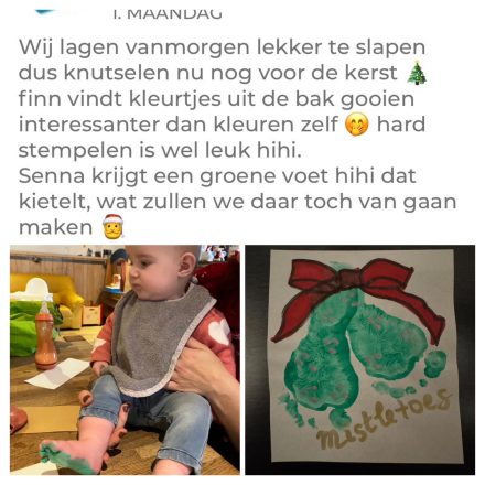 Maandag 8 december was het overal al vroeg dag en werk aan de winkel zowel Senna als Zayn poepte alles onder dus konden beide helemaal verkleed worden. Rob ging voor het eerst aan het werk bij zijn nieuwe baas en mocht meteen naar de AH o.a dus dat was wel leuk en hij werd dan ook meteen herkend. Senna ging naar zolderkids en beleefde weer van alles van een groentehapje eten tot het versieren van de kerstboom maar ze heeft ook haar eerste knutselwerkje gemaakt. Ik had eerst een relax momentje bij Desiree want die wilde op haar gemak in de douche dus ik zou op Zayn letten maar die sliep al vrij snel dus dat werd heerlijk B&B kijken. Daarna een paar boodschapjes gedaan en toen bij Desiree geluncht een rondje gelopen met Danielle en Rex en toen met Desiree en Zayn naar het consultatiebureau. Hij was weer goed aangekomen dus dik tevreden. Daarna bij Berna een bakkie gedronken en toen naar huis en daar van alles gedaan. Ruud toen hij thuis kwam eerst hard gelopen daarna gegeten en toen hebben we nog een klein rondje gewandeld. Daarna lekker voor de tv dat werd wel tijd.