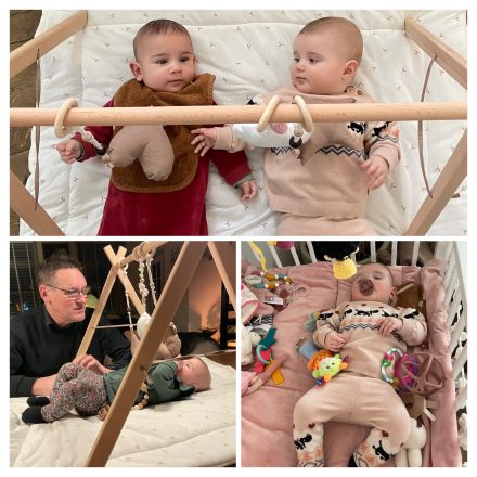 Donderdag 8 januari waren we al op tijd bij Danielle want die ging om 7.00 uur naar het werk en vandaag is het oppasdag. We hebben eerst wat gymnastiek gedaan bovenop de tafel en daarna was het toch tijd voor een dutje. Hier was het vandaag ook een binnen blijf dag want het weer laat het nog steeds niet toe dat we naar buiten gaan. Desiree en Zayn waren ook die kant op gekomen want dan kon Desiree Rex mooi uitlaten en ik ondertussen op de kids letten want met een dubbele wagen naar buiten was al helemaal geen optie. Zayn en Senna hebben ook nog samen onder de gym gelegen en hadden de grootste lol alleen Zayn heeft een grote kras opgelopen op zijn wang tot bloedens toe maar hoe hij dat gedaan heeft is een raadsel en hij huilde ook niet in een keer was hij er.